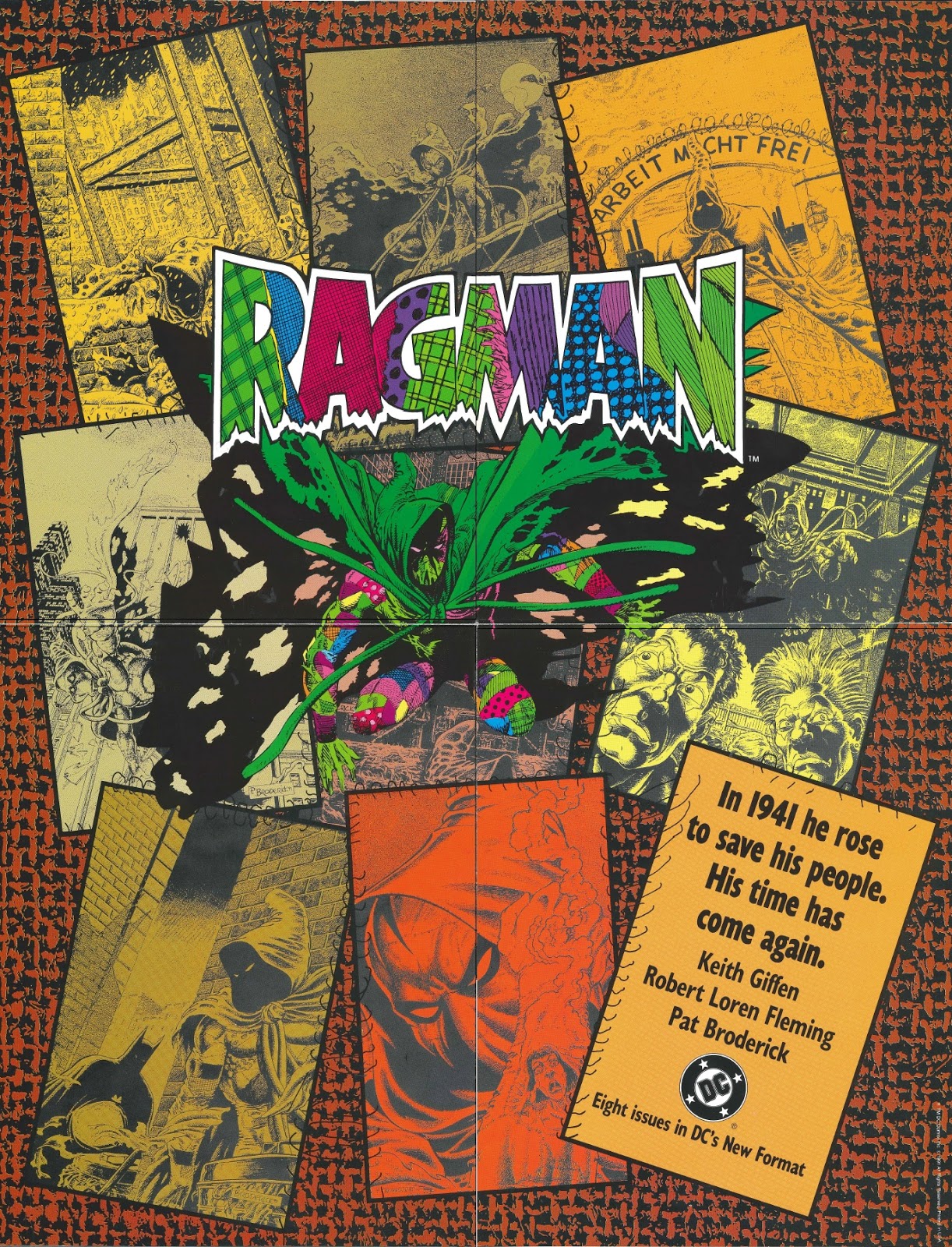 Needless to say, this poster features work by the incomparable Pat Broderick. Assembled behind Ragman are the cover images from all eight issues of the mini-series and the figure of Ragman himself seems to come from the final page of the first issue of the series...